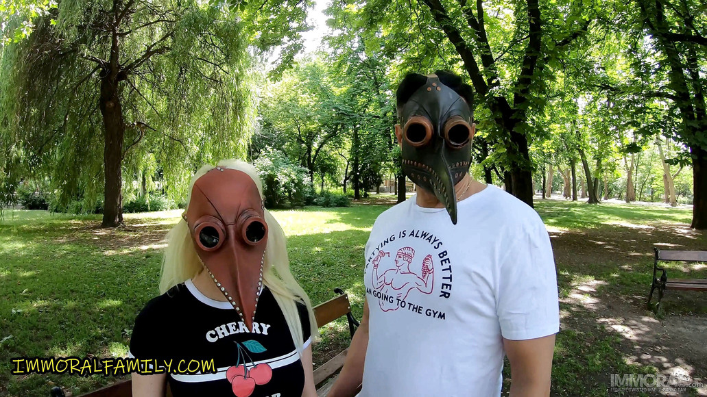 Porno Dan and his stepson head to the park with the coronavirus mask that his friend claims have magical powers. The crazy-looking mask looks like something more like a doctor in medieval times would wear during the plague than something that will bring good luck. When they get to the park, they are shocked to see a girl with a blonde with an amazing body sitting on a bench wearing something similar. Dan approaches her and she says he is looking for her hero he volunteers to be the one to save her and she happily agrees to accompany him. When they get back to his place she quickly disrobes, and the real magic begins. He fucks this busty blonde like a man possessed and shoots a massive load of semen on her little bush.